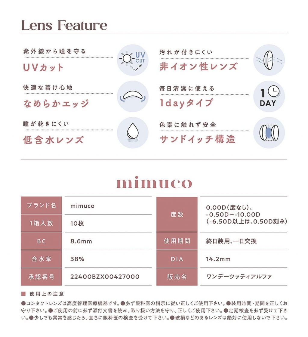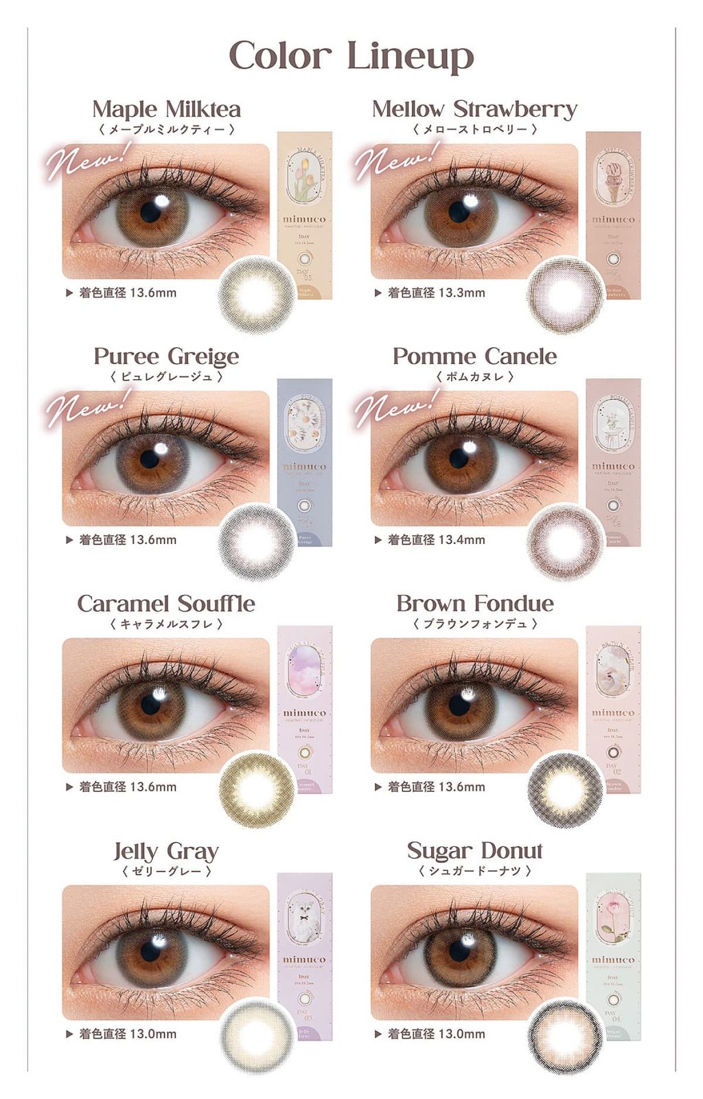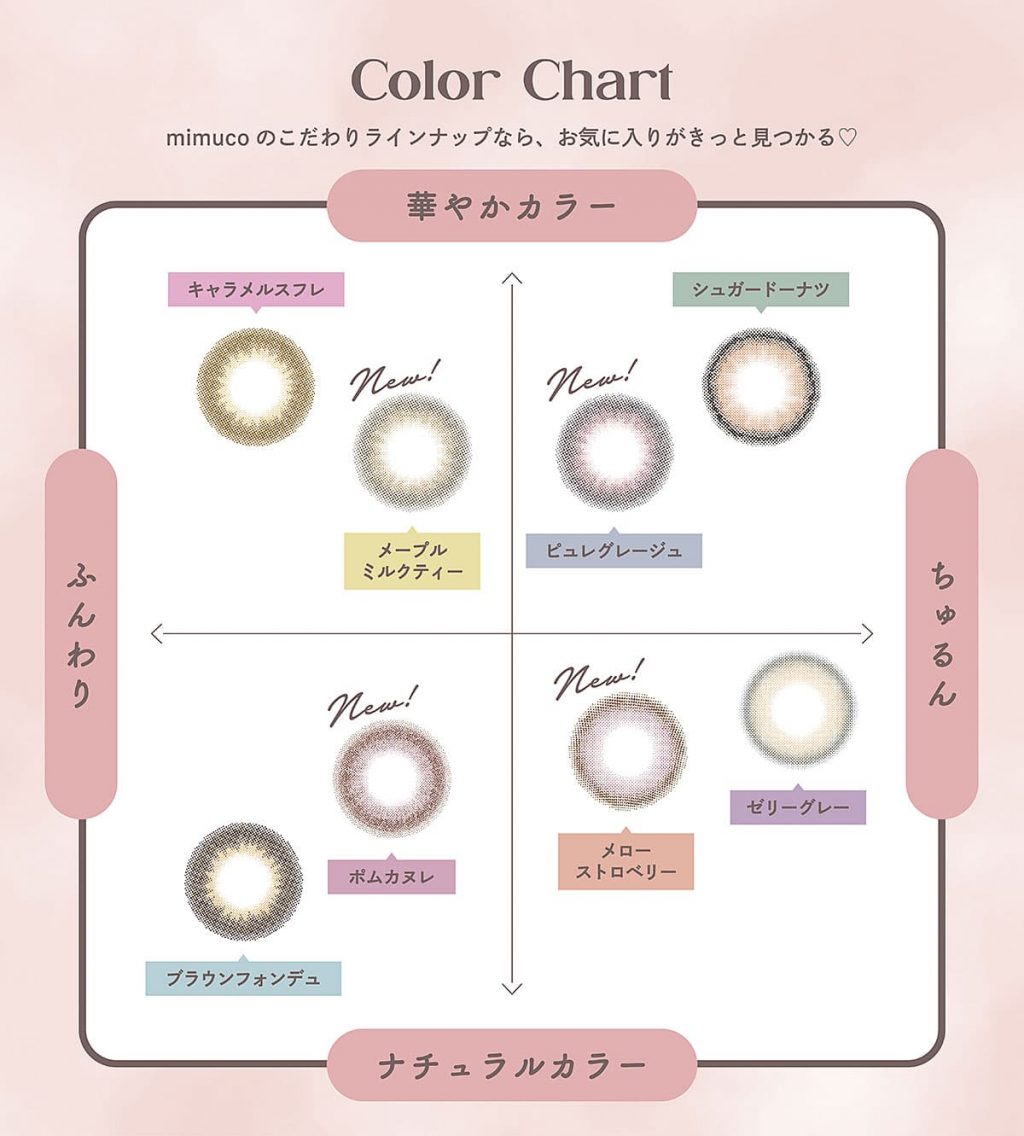 みきぽんのカラコンブランド mimuco(ミムコ)”は、 『ゆるっとふわっと日々を可愛く』 肩ひじ張らずに可愛くなれるナチュラルレンズ。 かわにしさん自身が「毎日使いたい!」と思えるまで 約2年間試作を重ねた4種のカラーに、今回新色4カラーを追加! コンプレクスをカバーするために 「かわいい」を研究し続けてきた、 かわにしさんならではの 自分に自信が持てる毎日カラコンです。